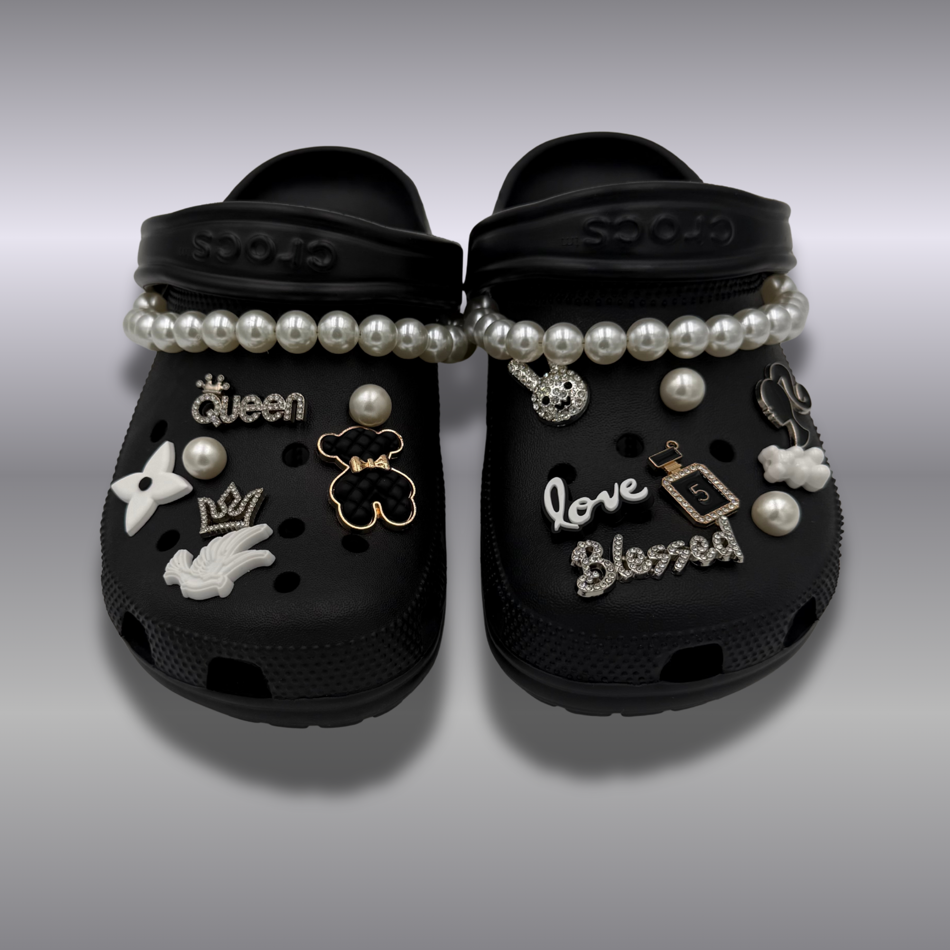 Opte pour un look stylé et raffiné avec cette paire de Crocs officielles customisées noir & métal. Le lot inclut la paire de Crocs authentiques ainsi que nos pin’s exclusifs : perles brillantes, couronne, “blessed”, parfum, ourson et queen… Tous en version chic et étincelante. Une paire qui allie classe, brillance et originalité ✨