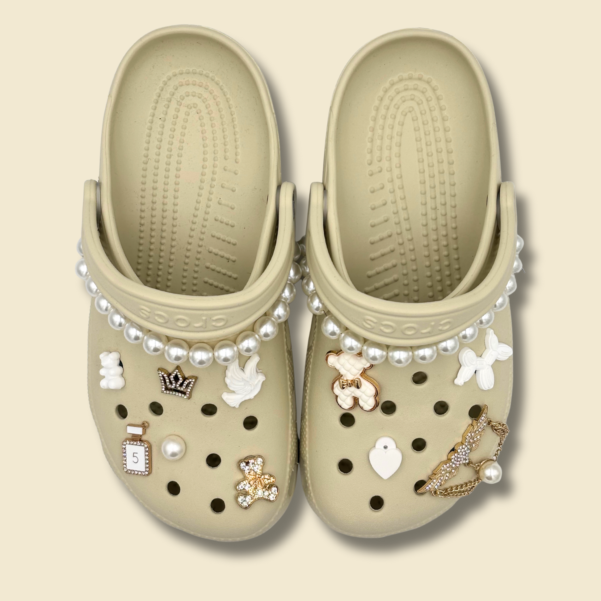 Opte pour un look chic et lumineux avec cette paire de Crocs officielles customisées blanches & argentées. Le lot inclut la paire de Crocs authentiques ainsi que nos pin’s exclusifs : colombe, flacon de parfum, collier de perles… Un style épuré et raffiné qui fait la différence.