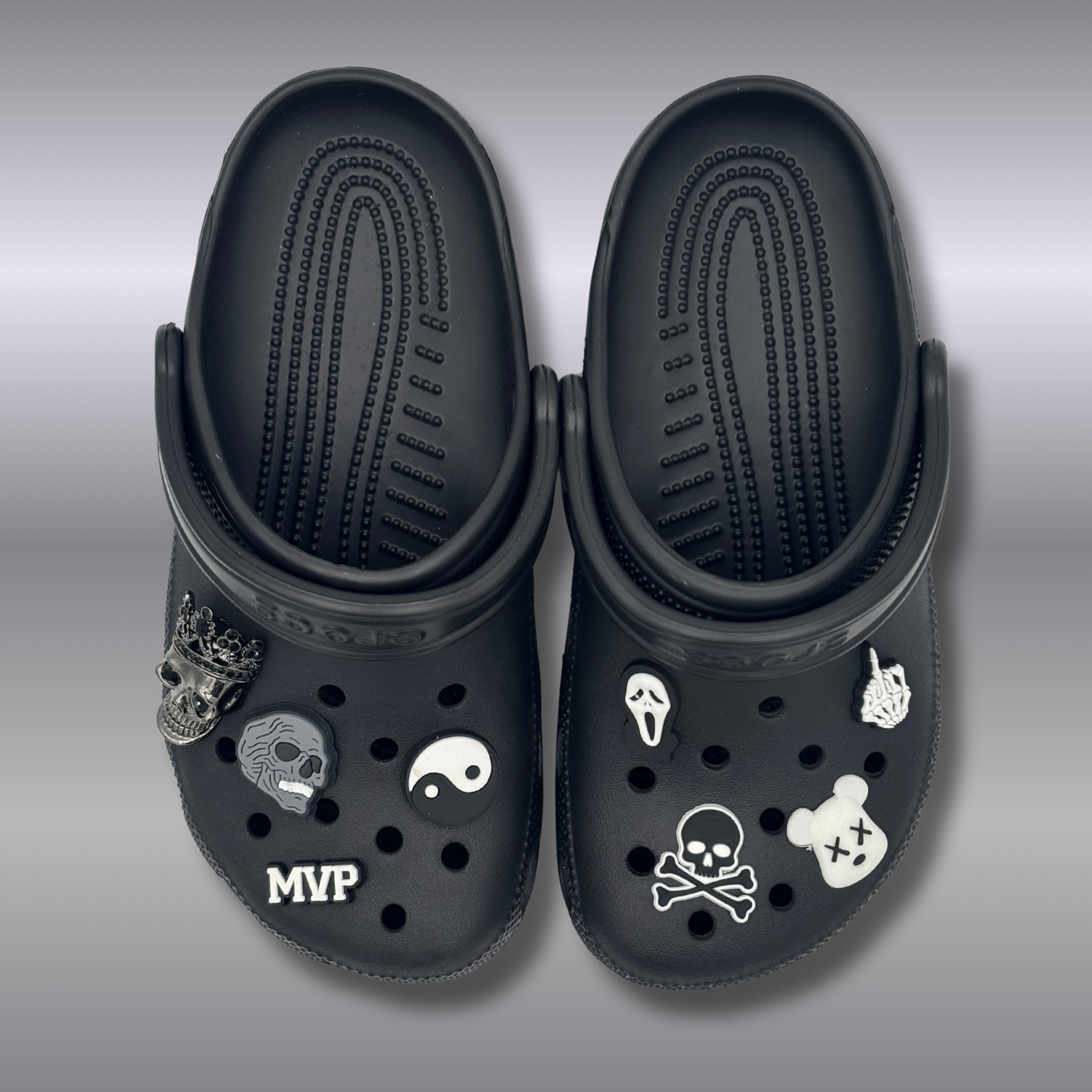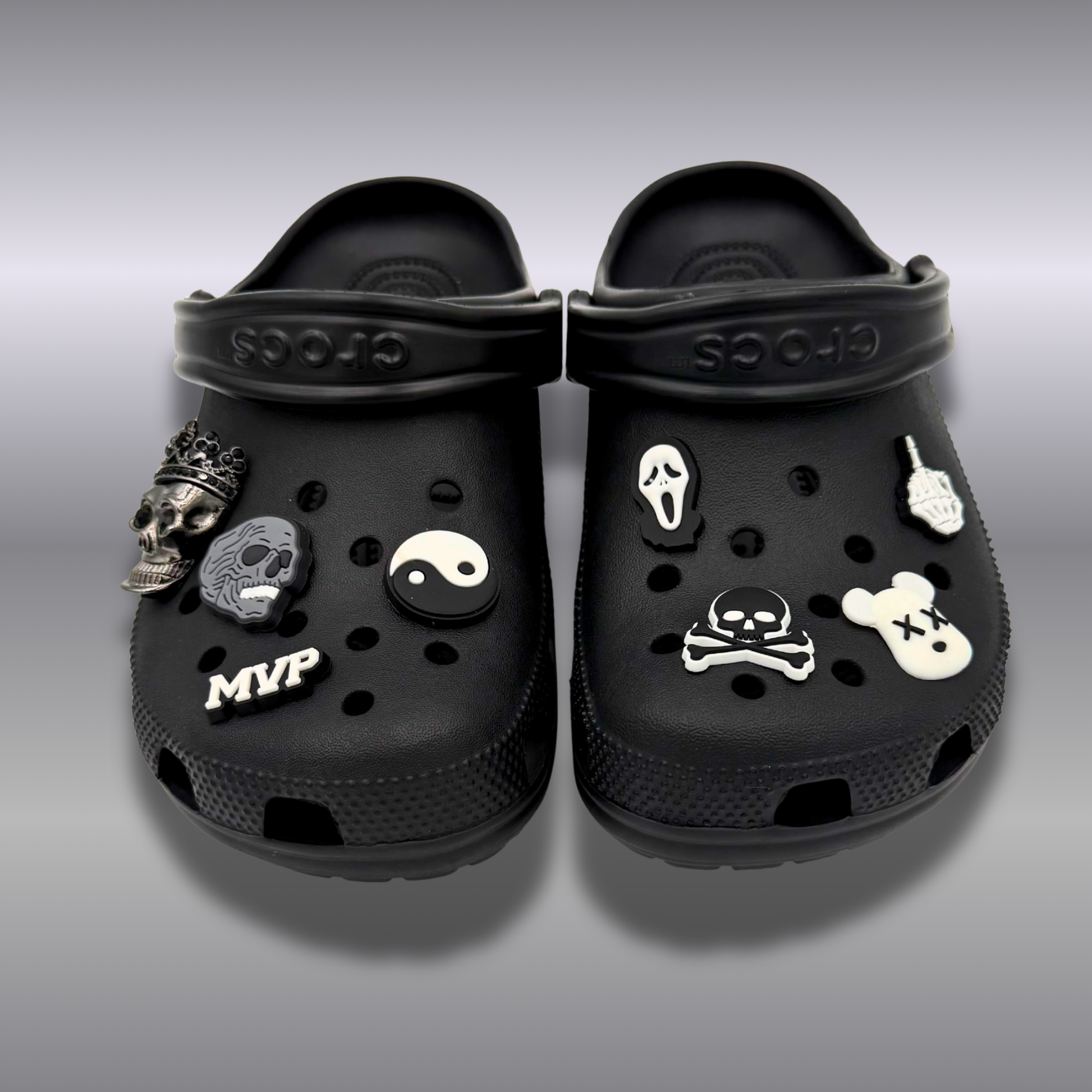 Affirme ton style rebelle avec cette paire de Crocs officielles customisées à l’ambiance dark et décalée ! Le lot contient la paire de Crocs authentiques ainsi que nos pin’s exclusifs : une tête de mort, un vampire et un doigt d’honneur version squelette. Des pin’s noir et blanc qui donnent à ta paire une allure unique et impossible à ignorer 🖤