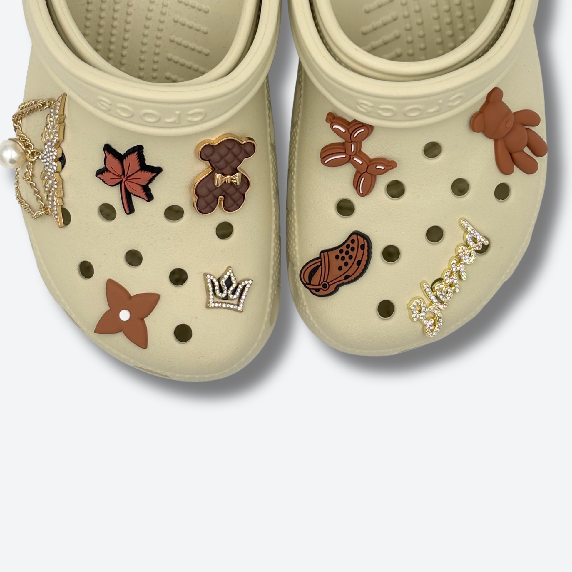 Ce pack rassemble des pin's aux tons marron et dorĂ© : couronnes royales, oursons trop mignons, feuilles stylĂ©es⊠De quoi apporter une touche classe et naturelle Ă ta paire de sabots prĂ©fĂ©rĂ©e âš