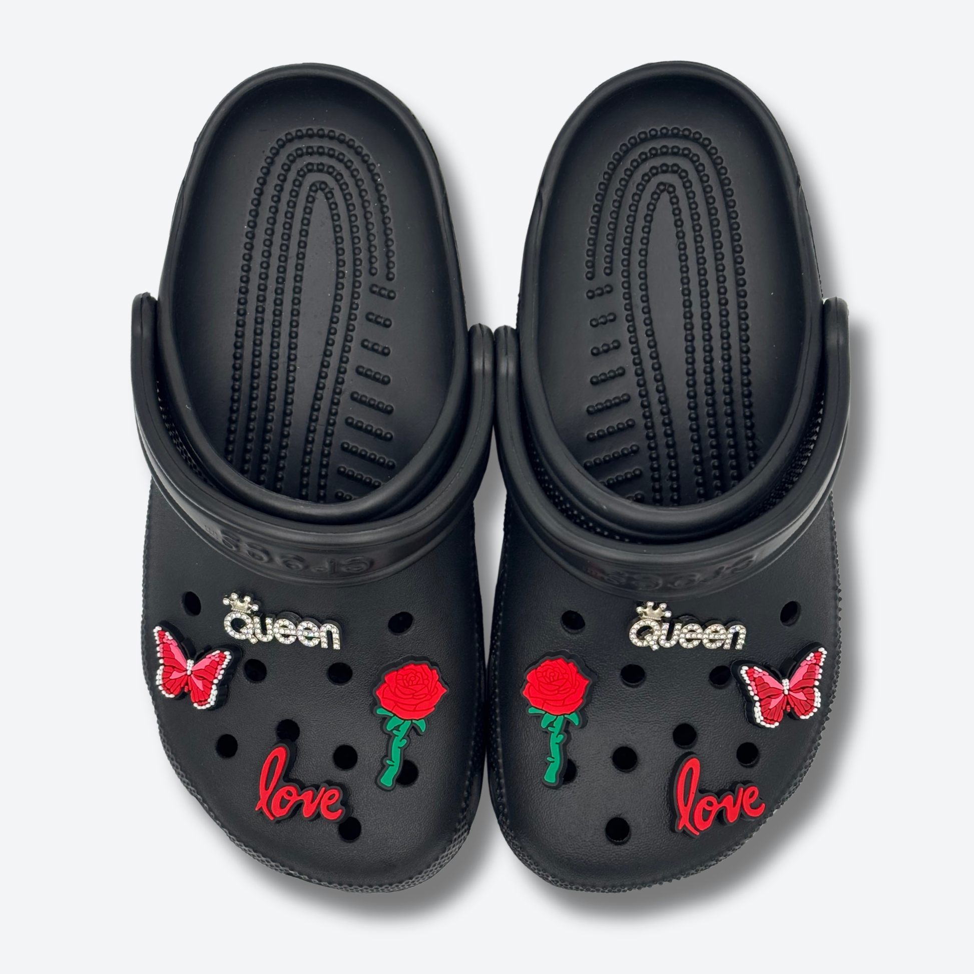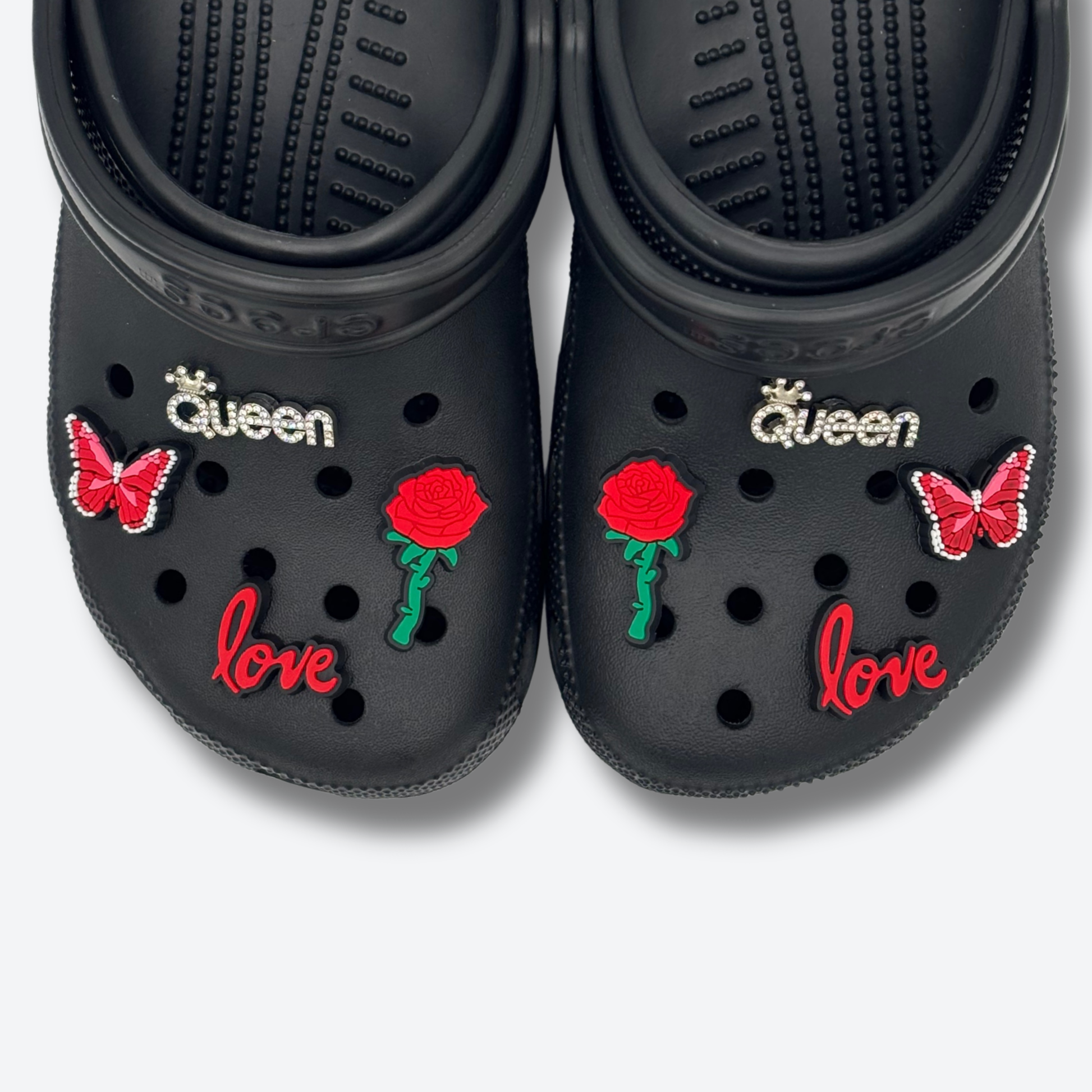 Deux fois plus de style avec les mêmes pin's en double : "queen", "love", papillon, rose, rouge… Un pack simple, classe et parfaitement assorti pour chaque pied.