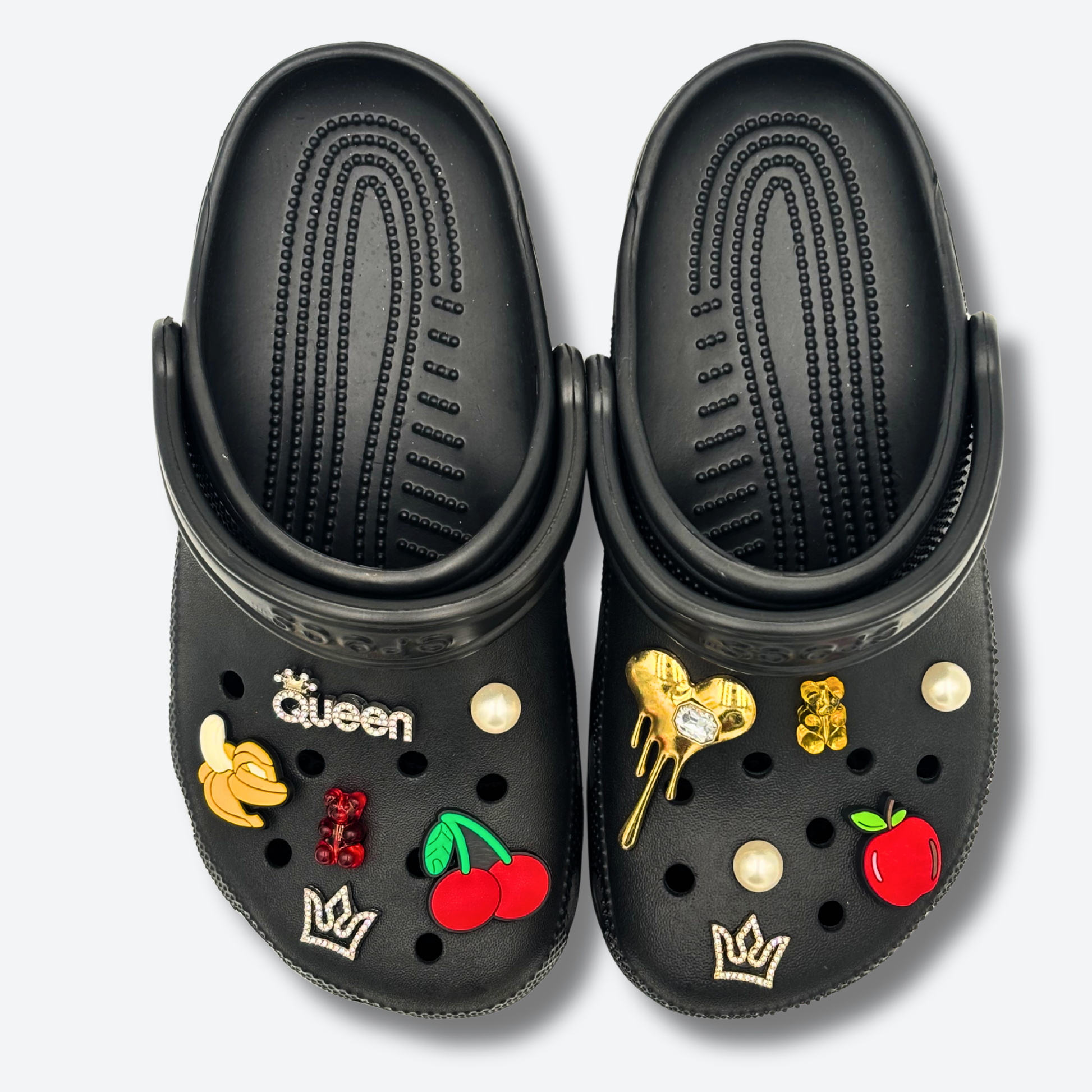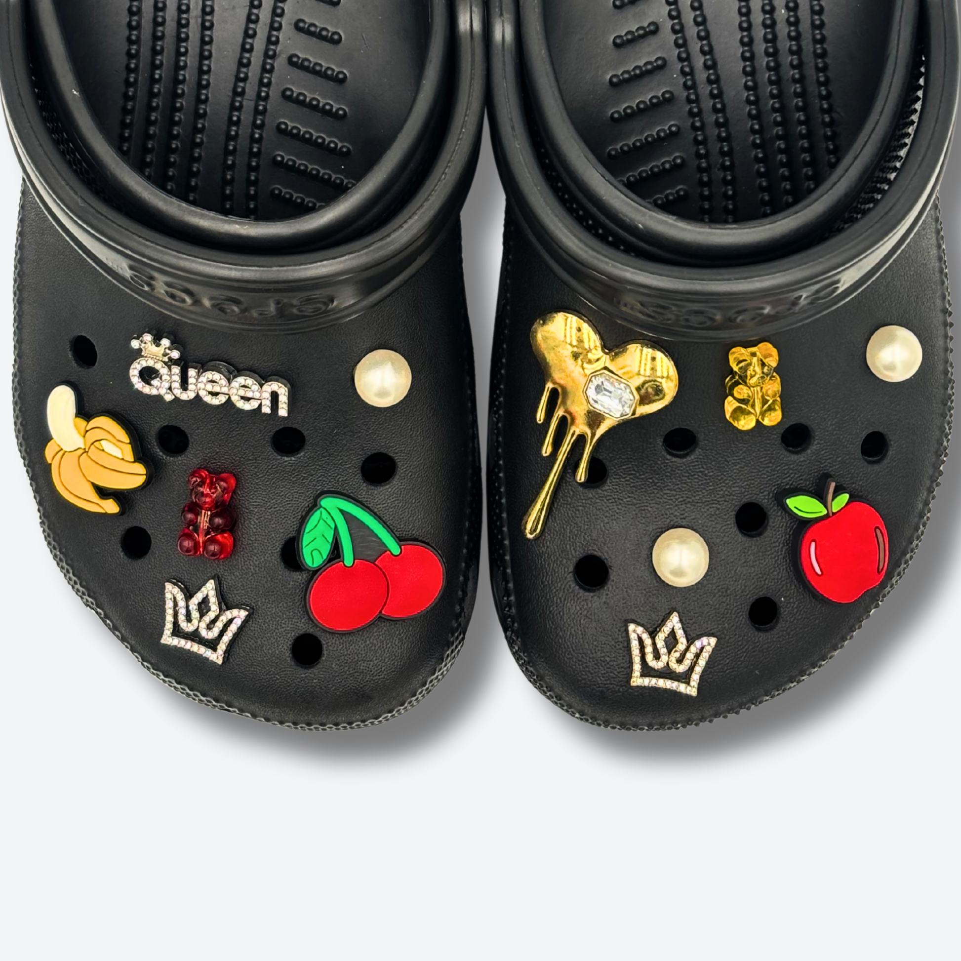 Un mélange fruité et flashy : cerise, banane, pomme, le tout accompagné de pin's dorés "queen" et couronnes. Un pack plein de couleurs et de peps pour une paire fun et sucrée.