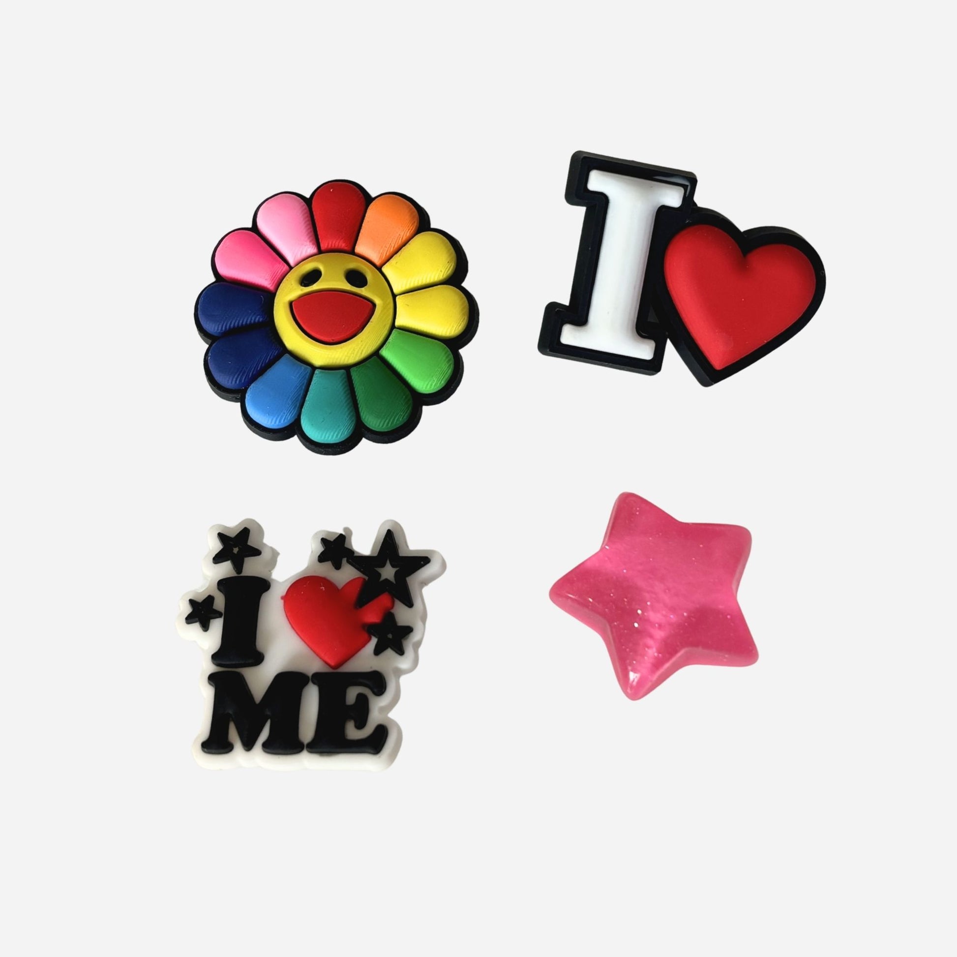 Ce pack de pin’s colorés pour clogs mélange énergie positive, couleurs rainbow et symboles love.
